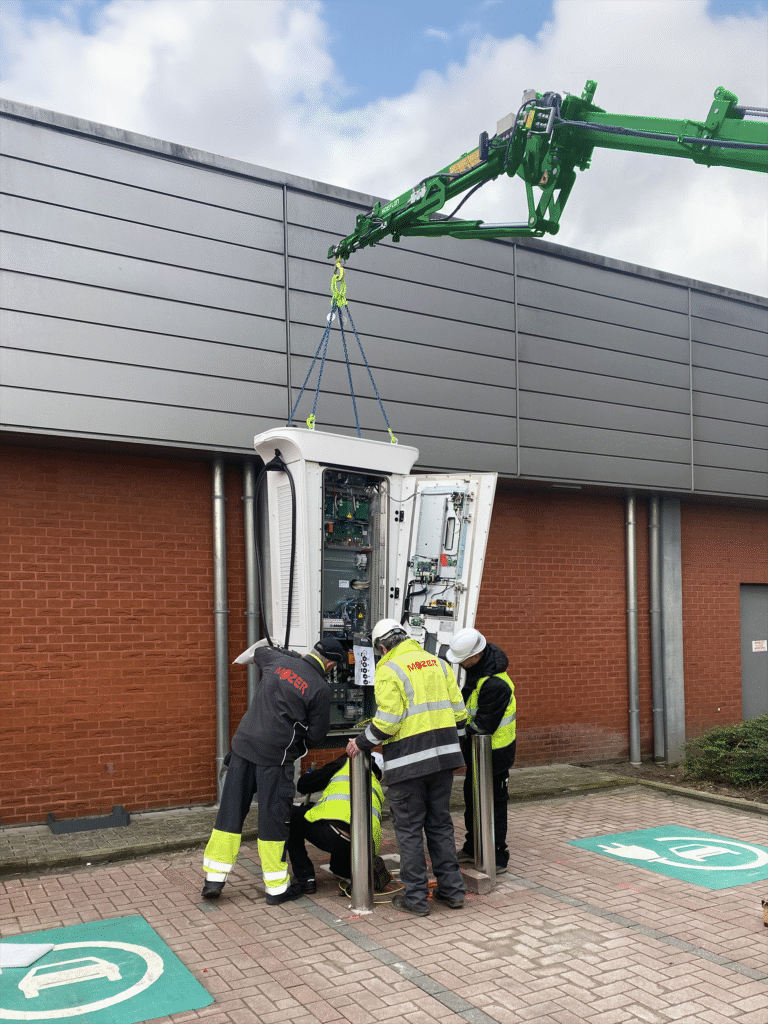 Grâce à l’expertise acquise de nos collaborateurs techniques, nous pouvons désormais, depuis 2023, installer et stocker des stations de recharge de grande envergure. Vu le niveaux de sécurité requis, notre responsable sécurité et prévention effectue des pré-visites avec ou sans plan de sécurité, afin de s’assurer que l’installation s’effectue de manière professionnelle et sécurisée.